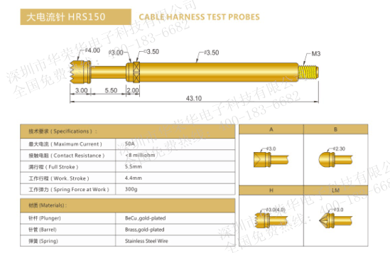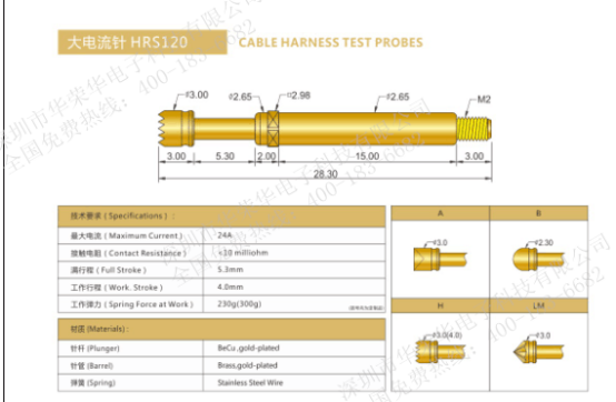大電流針用于高電流行業的測試。主要測試、功能測試、信號傳輸、供電、生產期間以及作為內置的觸電元件,還有一項應用用途是精確測量,針對該用途要用電阻很低的測試探針,所以也叫底電阻探針。