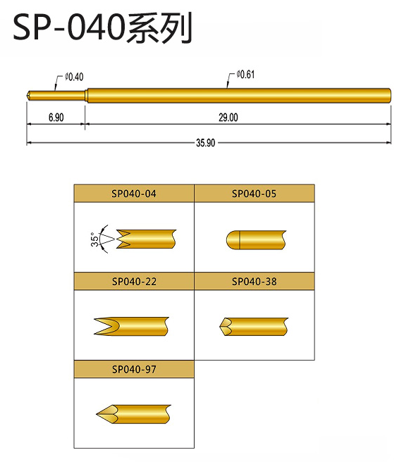 1、SP040探針的針身直徑是0.61mm,總長:35.90mm,頭部直徑0.40mm,額定電流:2A,接觸電阻:30毫歐姆,接觸彈力是80gf,適用于多種測試環境。