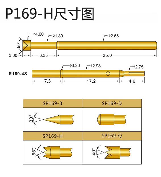 8、SP169測試探針的直徑:2.68mm,總長:34.35mm,頭部直徑:4.0mm,額定電流:5A,接觸電阻:50毫歐姆,建議鉆孔尺寸:3.0mm。