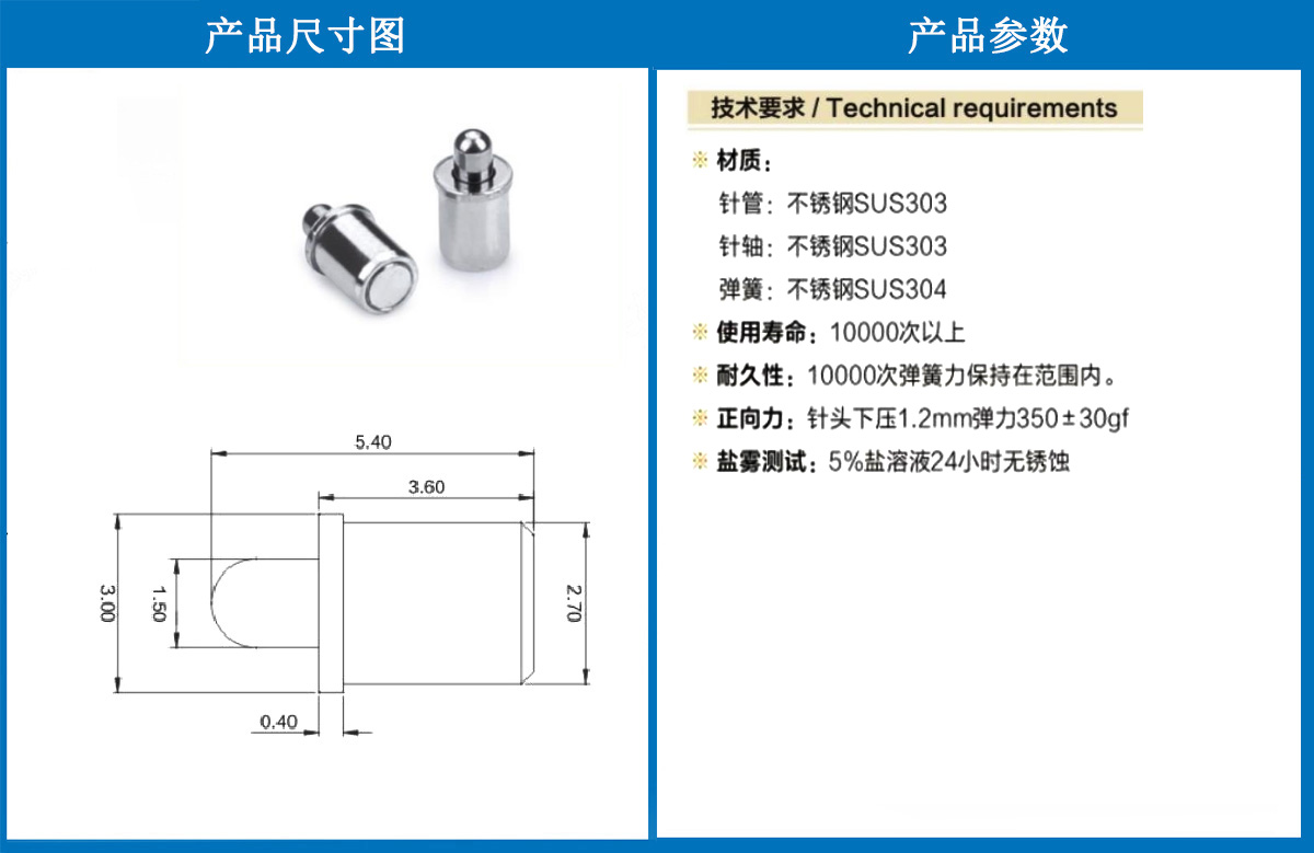 大電流測試探針的種類大電流探針塊產品由數個彈簧連接件集成于金屬塊上組成,尤其適合測試表面不平或傾斜的待測體。可直接安裝在金屬材料中獲得最大接觸面積扁狀端子大電流測試由于防轉動設計,針頭可以根據待測體方向而準確定位。當針頭與扁狀端子接觸時,針頭還有20度的扭轉公差。因此在測試過程中不會對待測表面產生任何刮傷損壞采用偏斜球體設計的大電流針金屬球的傾斜式針頭設計可有改善探針針頭和針管內壁的電傳導性。當針頭唄壓縮時,彈簧力能將針頭偏向針管內壁,增大接觸面。分離式結構設計的大電流探針采用分離式斜面設計的針頭,能最大化的增加針頭與針管內壁接觸面積。顯著增大載流量;這樣的特殊設計,能使電流盡可能通過針管管壁流通,將彈簧上流過的電流最小化。連動式結構設計的大電流探針保證最小的內阻同時能最大限度的承受大電流。由于是連動式結構,因