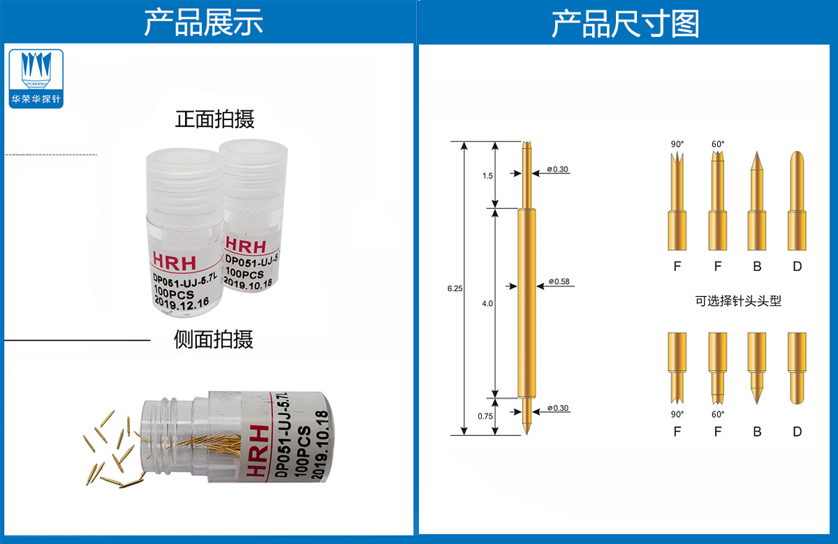 產品介紹:探針外徑為0.51mm,總長度為5.7mm、針的兩端的頭型為爪頭,圓頭