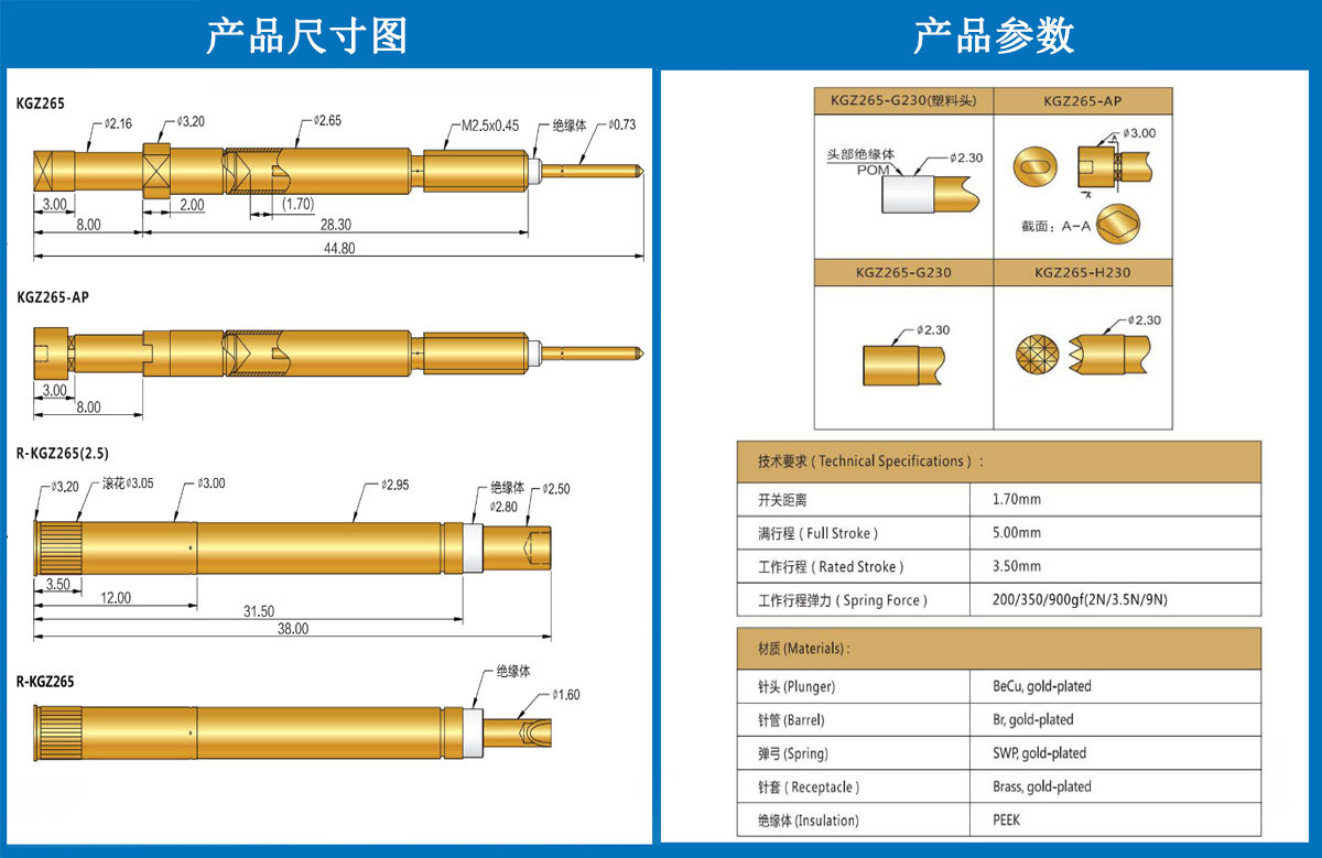產品簡介:KGZ165探針、2.65mm測試針、總長44.80mm、彈簧針、測試針